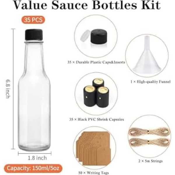 【Food Grade Glass】These hot sauce bottles are made of high quality food grade glass, BPA free and lead free, durable and reusable. Their high visibility allows you to easily see the contents inside. Ideal for everyday use in the kitchen or restaurant AIRTIGHT SEAL & PROFESSIONAL FINISH Each glass hot sauce bottle features a black screw cap with a reducer for precise, clean dispensing. And the screw top creates a secure barrier against air and leaks, keeping contents fresh, while the shrink capsule adds a professional finish that stands out on shelves PORTABLE & EASY TO FILL With the slim and slim shape, these 5oz bottles are easy to hold and store. The perfect size makes the small bottles suitable for on-the-go meals, parties, picnics and more. The well-sized opening works seamlessly with the included funnel for fast, spill-free filling. Refrigerator and dishwasher safe (without lid) MULTIPURPOSE These woody bottles are great for storing homemade hot sauce, salad dressing, syrup, spices, oils, wine, cocktails, vinegar, limoncello, vanilla extracts, drinks, liquor, whiskey, etc. You can also use the pendants and hemp ropes to make personalized gifts for your family and friends on any occasion such as birthdays, weddings, shower gifts, Christmas and anniversaries PACKAGE INCLUDED Each set comes with 35 5 oz empty hot sauce bottles with black screw caps and drip opening reducers, bonus 35 black PVC shrink capsules, 1 funnel, writing labels and a bundle of string. All of them are carefully packed in a foam tray to protect them from damage and cracks. If they still break, please contact us › See more product details