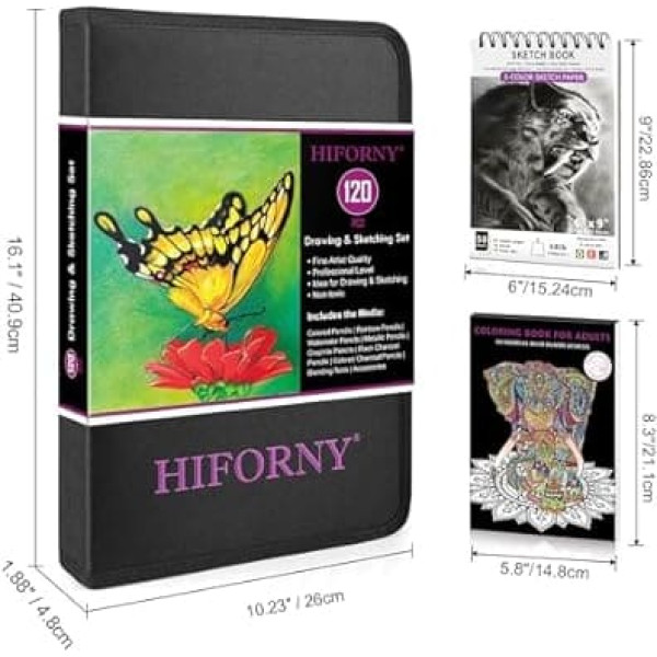 UNIQUE RAINBOW & COLOR CHARCOAL PENCILS Contains 12 rainbow colored pencils with soft, break-resistant 4mm cores. Each pencil mixes at least three colours, creating smooth, natural gradients and vibrant mixed colour effects. Also comes with 12 richly pigmented coloured charcoal pencils that combine colourful pigments with carbon particles that deliver the matte texture and depth of the charcoal while providing a rich and natural colour expression. The result is a softly mixed, low-saturation artwork full of layers. COMPLETE DRAWING ACCESSORIES HIFORNY 120pcs art set includes 8 kinds of professional drawing pencils. You can try different drawing styles. These pencils contain 12 charcoal pencils, 12 graphite pencils, 12 black coloured pencils, 12 watercolour pencils, 12 metallic colouring pencils, 12 rainbow pencils, 12 coloured pencils, 12 coloured charcoal pencils, 1 eraser. Laser pencil with brush. Each pencil is marked with name and model, perfect for drawing, sketching, shading, layering, blending and more. ESSENTIAL DRAWING TOOLS This versatile art set also includes almost all accessories for sketching and drawing. Includes 3 mixing stumps, 1 sketch wiper scraper, 20 replacement heads, 1 white gel pen, 1 water brush pen, 2 brushes, 1 vinyl eraser, 1 sandpaper block, 1 plastic sharpener, 1 art knife, 1 pencil extension. These extras are essential for artists and beginners. Unique 3 Color Sketchbook & Coloring Book:6x9 inch 100gsm 50 pages (30 pages white, 10 pages tinted, 10 pages black). Different colors of sketch paper are suitable for different kinds of drawings, a sketchbook can meet your needs for different colors of sketch paper, you don't need to spend more money to buy different colors. Colors of Sketchbook A5 Coloring Book 160gsm 20 Unique Doodle Illustrations Premium paper accepts a variety of painting tools. Each illustration is also a postcard that can be sent anywhere as long as it is stamped. Artist quality drawing pen set: pre-sharpened, the lead core is smooth, durable, easy to sharpen and erase. The art pens for shading and mixing allow you to develop technical skills and easily create beautiful works. Bright and vibrant colours ensure smooth colouring, easy shading and mixing, drawing, sketching, doodling and colouring. TRAVEL SIZE PORTABLE PENCIL CASE The lightweight zippered pencil case is 409mm x 260mm x 48mm and is made of a durable water resistant oxford fabric, which is suitable for you to take with you. Take it with you to school, college or outdoors for drawing and sketching on the go. The durable and compact design of the case ensures that your utensils stay organized and protected. Perfect gift for art lovers: This art pen set is a perfect gift for artists, students and anyone who likes to sketch and draw. Ideal for a variety of art projects, from simple sketches to intricate drawings. An excellent gift for Christmas, Thanksgiving, Valentine's Day, Easter, New Year, birthday and graduation. › See more product details
