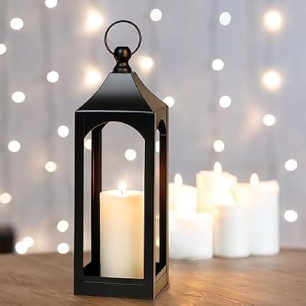 HIGH QUALITY CANDLE LANTERN Made of high quality metal and an elegant black top ring, this lantern guarantees a safe and cozy atmosphere when lit with different types of candles. VERSATILE DESIGN CANDLE HOLDER LANTERN Its simple style blends effortlessly with a variety of lighting and decor themes, making it suitable for both indoor and outdoor spaces such as yards, walls, pathways, driveways, shelves, tables, bars, patios and porches. CONVENIENT HANGING OR PLACE The lantern features a movable hanging ring for easy hanging, or it can be placed on any flat surface. Its wireless and lightweight design allows effortless portability. COMPATIBILITY Suitable for different types of pillar candles, tea lights or LED candles. The black candle lantern size: 13 x 13 x 43 cm, fits most standard pillar candles (candles are not included). and provides a perfect addition to any ambience. MULTIFUNCTIONAL DECORATION Whether used as a standing decor piece, table centerpiece, or wall decor, this versatile lantern is an ideal choice to enhance the ambiance of your home, porch, patio, deck, or any area you want to illuminate. › See more product details; Product description Black metal lantern; Product description Black metal lantern; Black metal lantern