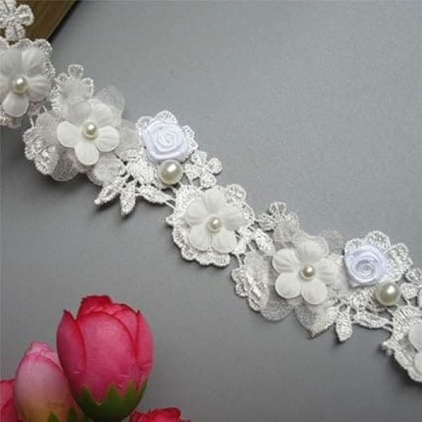 Measures 1.8 metres length and 4 cm width delicate white lace trim with rose petals and pearl details Material composition: vintage embroidered fabric trim with intricate rose patterns and beaded accents along the edge VERSATILE APPLICATIONS Perfect for wedding dress embellishments, craft projects, card making and clothing decoration Design Features Elegant scalloped edge with detailed rose petal motifs and pearl embellishments in classic white color SEWING FRIENDLY Fabric trim can be easily attached using standard sewing techniques for various decorative applications › See more product details