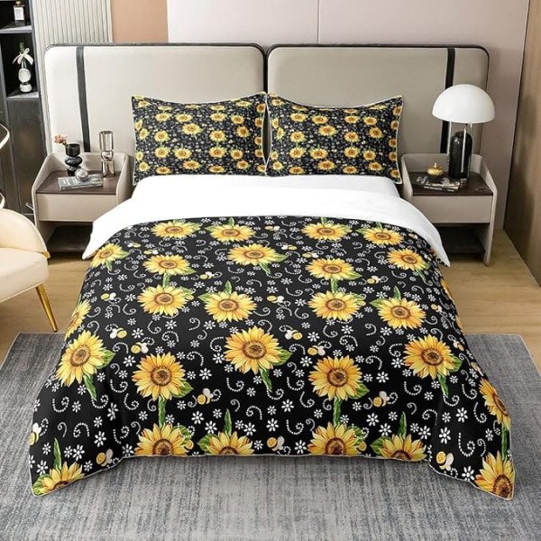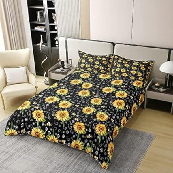Homewish Duvet Cover 220 x 240 cm Sunflower 100% Cotton Bedding Set Bee for Kids Girls Boys Bedding Yellow Flowers Duvet Cover Cute Soft
