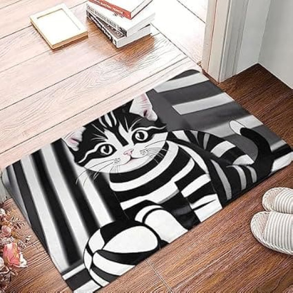 DLXW Dicker Flanell rutschfeste Fußmatte – Mehrzweck-Teppich für Innen- und Außenbereich, für Haustür, Küche, Bad, langlebig und leicht zu reinigen, schwarz-weiß gestreiftes Kätzchen