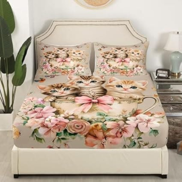 Lovely Cat Bed Sheet Set Cute Kitten Pet Animal European Pink Bowknot Cup Sheet Sets Deep Pocket (No Flat Sheet), Vintage Garden Flowers Butterfly Mattress Cover, Single with 1 Pillowcase