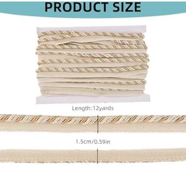 Beige twisted polyester cord: this twisted cord is made of high-quality polyester in a warm beige tone. It features a tight twist structure, hold shape well, fit the needs of twisted lip cords for crafts and decoration Size: the versatile trims are 12.5 yards long and 0.24 inches / 0.6 cm wide, it is flexible enough for easy handling, and can be washed by hand in cold water for long-term use and then air dried Robust and durable: the twist trim cord rope does not fray easily and does not wear out, retains its twisted appearance even after cutting or processing, suitable for decorative details in DIY or decoration area Matches any style: the beige colour of this cord rope with twisted decorative cords matches most colour and interior styles, shows modern minimalism to cosy rustic, making it perfect for eye-catching and subtle design looks Versatile for home and crafts: the cord rope embellishment is a top choice for home decoration, curtain tiebacks for upholstery curtains. You can use it for curtain tiebacks, furniture trim, wrapping paper, or DIY crafts › See more product details; Product description Specifications: Material: polyester. Colour: beige. Size: 12.5 metres long, 0.24 inches / 0.6 cm in width. Notes: Please allow slight deviation due to manual measurement.Colors may vary from computer screen. Perform a patch test to check skin sensitivity.; Product description Specifications: Material: polyester. Colour: beige. Size: 12.5 metres long, 0.24 inches / 0.6 cm in width. Notes: Please allow slight deviation due to manual measurement.Colors may vary from computer screen. Perform a patch test to check skin sensitivity.; Specifications: Material: polyester. Colour: beige. Size: 12.5 metres long, 0.24 inches / 0.6 cm in width. Notes: Please allow slight deviation due to manual measurement.Colors may vary from computer screen. Perform a patch test to check skin sensitivity.