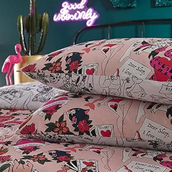furn. Inked Duvet Cover Set - Tattoo Inspired Cartoon Print with Reversible Design Polycotton Bedding (Pink Blush - Super King)
