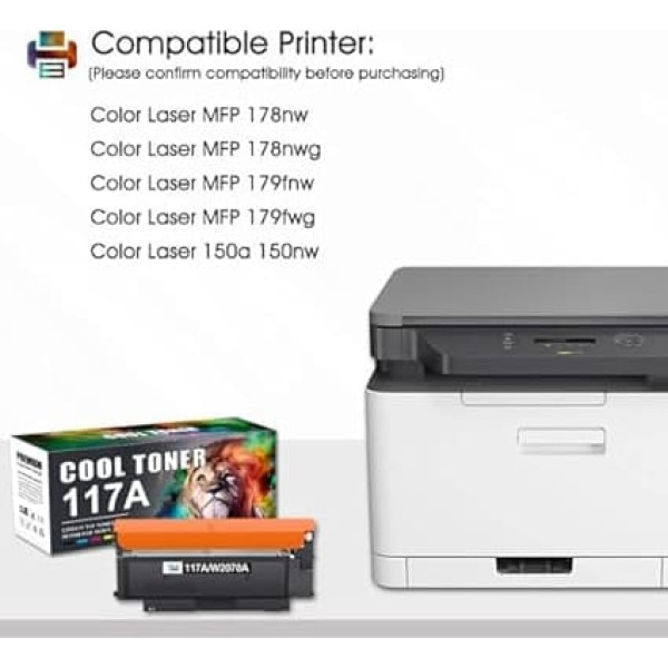 Cool Toner Compatible with 117A toner set: 117A W2070A W2071A W2072A W2073A (not original) Compatible laser printers: Color Laser MFP 178nwg 178nw 179fwg 179fnw 178 179 printer Compatible printers: Color Laser 150a 150nw 150 printer Product family: compatible 117A W2070A black, 117A W2071A cyan, 117A W2072A yellow, 117A W2073A magenta Capacity of the toner cartridge: approx. 1,000 pages (black), approx. 700 pages (colour) per 117A multipack colour toner cartridge (letter/A4, at 5% coverage) › See more product details