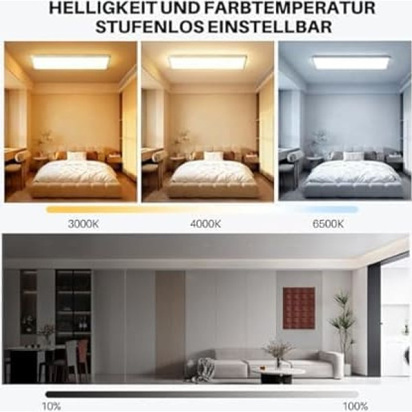 This LED ceiling light allows continuous colour temperature control from 3000K to 6500K and precise brightness control from 0-100%. With one press, it adjusts the light: invigorating cold light for work, neutral natural light for everyday life, cosy warm light for relaxation. The flat LED panel is ideal as a kitchen lamp or ceiling light - more than lighting, your creative tool for perfect atmosphere. Light combinations of your choice: the main LED panel and night light can be used together for room-filling light or individually. The LED ceiling light provides powerful lighting during the day, gentle orientation light at night. The smart mode remembers your setting - the next time you switch on, the ceiling light immediately shines in your feel-good light. Maximum flexibility, optimum utility. Immerse yourself in the soothing 3000K warm light with only 10% brightness - this LED ceiling light creates a sleep-promoting atmosphere. The one-hour smart timer ensures that the kitchen lamp ceiling automatically switches off after you fall asleep. No need to manually switch off - so relaxed sleep is effortless. With a diameter of 58 cm and only 2.5 cm height, this ceiling light integrates perfectly into any room ceiling. The 24 W LED ceiling light provides even, efficient basic light for standard sized rooms. This versatile LED panel combines elegant flat design with high functionality - the ideal kitchen lamp for demanding lighting. With the remote control, you can control the ceiling light comfortably from the room - main light, night light and lighting mood. Easy installation without additional wiring saves costs and prevents cable clutter. So you can enjoy slim elegance on the ceiling with this LED ceiling light flat. › See more product details; Product description LED ceiling light – LED panel light 58 x 20 x 2.5 cm; Product description LED ceiling light – LED panel light 58 x 20 x 2.5 cm; LED ceiling light – LED panel light 58 x 20 x 2.5 cm