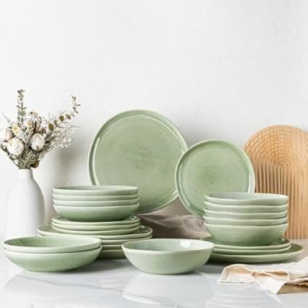 GBhome Stoneware Crockery Set for 6 People, 24-Piece Reactive Glaze Handmade Crockery Set, Microwave & Dishwasher Safe Bowl and Plate Set, Quiet Green