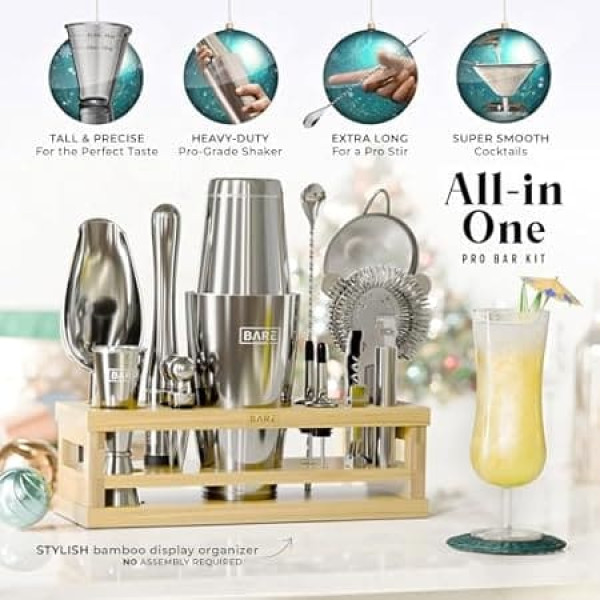 ✔ The last drink blender set you'll ever need. A complete bartending kit with all the essential equipment you need to shake and mix delicious alcoholic beverages and mocktails for adults ✔ THE ULTIMATE EYE-CATCHING DISPLAY Never misplace your bar tools again with this beautiful bamboo organizer holder. A bar set designed to declutter your kitchen with utensils or accessories ✔ GIFT A GREAT TIME The perfect cocktail set for couples for men and women, whether it's an amateur starter mixologist or professional barker. Treat your boyfriend, girlfriend, husband, wife, fiancee, father, mother or work colleague. ✔ ENDLESS DELICIOUS RECIPES » Includes 35 recipe cards, so whether you like the taste of whiskey, vodka, rum, gin or tequila, you're covered! Enjoy an old fashioned margarita, martini, mojito... ✔ FORGET ROSTING » Buy confidently as we use high quality stainless steel. For added security, we offer a free 3-year warranty. All silver tools are also dishwasher safe › See more product details; Product description A bar mixing set that sets you apart. The Bare Bare Barrel 16 Piece Alcohol Mixer Shaker Set includes all the bar essentials you need to start your newfound passion: a cobbler shaker, muddler, Japanese measuring cup, bartender spoon, Hawthorne strainer, fine mesh strainer, corkscrew and bottle opener, ice scoop, citrus peeler, 2 bottle caps, 2 liquor pourers. he and a cleaning brush and a e. To put all these fantastic cocktail tools together, our bar shaker set comes with a beautifully lacquered modern wooden stand made of durable bamboo that is worth owning a place in your home for all your guests to see. Say hello to perfectly matching barset pieces with the patent pending muddler and bamboo stand that stands out while giving you more comfort. We save you the mess of owning cheaply made barware tools because we only provide you with high quality mixology utensils. All of our steel bartending tools are carefully manufactured to provide you with a high quality alcohol shaker set that will not rust and will last. Bare Barrel always has your back in exploring and fulfilling your passion for mixing drinks. We will accompany you all the way as we offer 24/7 VIP service to help you whenever you need it. And as a bonus, these bar sets include 35 recipe cards, so you can now make a glass of margarita, martini, or any popular cocktail you desire; Product description A bar mixing set that sets you apart. The Bare Bare Barrel 16 Piece Alcohol Mixer Shaker Set includes all the bar essentials you need to start your newfound passion: a cobbler shaker, muddler, Japanese measuring cup, bartender spoon, Hawthorne strainer, fine mesh strainer, corkscrew and bottle opener, ice scoop, citrus peeler, 2 bottle caps, 2 liquor pourers. he and a cleaning brush and a e. To put all these fantastic cocktail tools together, our bar shaker set comes with a beautifully lacquered modern wooden stand made of durable bamboo that is worth owning a place in your home for all your guests to see. Say hello to perfectly matching barset pieces with the patent pending muddler and bamboo stand that stands out while giving you more comfort. We save you the mess of owning cheaply made barware tools because we only provide you with high quality mixology utensils. All of our steel bartending tools are carefully manufactured to provide you with a high quality alcohol shaker set that will not rust and will last. Bare Barrel always has your back in exploring and fulfilling your passion for mixing drinks. We will accompany you all the way as we offer 24/7 VIP service to help you whenever you need it. And as a bonus, these bar sets include 35 recipe cards, so you can now make a glass of margarita, martini, or any popular cocktail you desire; A bar mixing set that sets you apart. The Bare Bare Barrel 16 Piece Alcohol Mixer Shaker Set includes all the bar essentials you need to start your newfound passion: a cobbler shaker, muddler, Japanese measuring cup, bartender spoon, Hawthorne strainer, fine mesh strainer, corkscrew and bottle opener, ice scoop, citrus peeler, 2 bottle caps, 2 liquor pourers. he and a cleaning brush and a e. To put all these fantastic cocktail tools together, our bar shaker set comes with a beautifully lacquered modern wooden stand made of durable bamboo that is worth owning a place in your home for all your guests to see. Say hello to perfectly matching barset pieces with the patent pending muddler and bamboo stand that stands out while giving you more comfort. We save you the mess of owning cheaply made barware tools because we only provide you with high quality mixology utensils. All of our steel bartending tools are carefully manufactured to provide you with a high quality alcohol shaker set that will not rust and will last. Bare Barrel always has your back in exploring and fulfilling your passion for mixing drinks. We will accompany you all the way as we offer 24/7 VIP service to help you whenever you need it. And as a bonus, these bar sets include 35 recipe cards, so you can now make a glass of margarita, martini, or any popular cocktail you desire