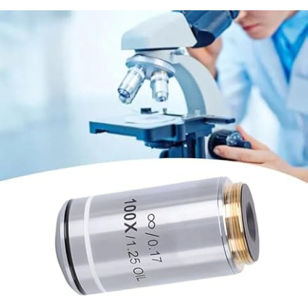 Compatibility The standard 20.2mm interface design is compatible with most biological microscope brands and allows easy upgrades and exchanges.Widely used in education, research and environments. SUPERIOR IMAGE QUALITY With an infinite optical system, the plane lens minimizes spherical aberration and distortion, delivering clear images with parallel light paths and no edge blur for professional observation. High-resolution observation: The 100x lens is suitable for areas such as cytology, microbiology and environmental observation. It can be used for first imaging or for further enlarged observations, thus covering different research needs. SCIENTIFIC MAGNIFICATION DESIGN Low magnification provides a wide field of view and high brightness for overall observation, high magnification magnifies details considerably for studying small structures such as cells and dust. Improved optical performance: the 100x microscope lens made of fully coated optical glass improves light transmission and reduces stray light. Experience clearer images with true colour rendering. › See more product details; Product description Specification: Item Type:100X Microscope Objective Lens Material: aluminum alloy, optical glass Thread Diameter: 20.2mm/0.8\; Product description Specification: Item Type:100X Microscope Objective Lens Material: aluminum alloy, optical glass Thread Diameter: 20.2mm/0.8\; Specification: Item Type:100X Microscope Objective Lens Material: aluminum alloy, optical glass Thread Diameter: 20.2mm/0.8\