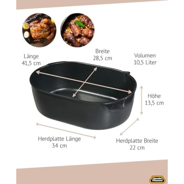 Cast iron roasting pan with spout 41.5 x 28.5 cm, height 13.5 cm, matching glass lid included PFOA-free, energy-saving, environmentally friendly, 100% recyclable › See more product details; Product description This cast roasting dish with glass lid is recommended for 5 people and over. If you want to prepare large geese, ducks, game dishes or several whole chickens, this roasting pan is a must. Especially suitable for roast pork or large quantities of goulash, roulades or stews. The pouring device allows you to pour out your sauces comfortably and cleanly. - Approx. 8-10 mm thick battery thermal base for even heat distribution up to the edge. - Protects the environment and saves energy thanks to short heating time and heat retention. - Gundel titanium ceramic surface for health-conscious and low-fat frying - Sturdy wall and reinforced pouring rim. - Oven-safe handles, glass lid available as accessories. - PFOA-free for health-conscious frying - Gundel Pfannen are cast pans that are cast by hand in an elaborate, special casting process, under constant quality controls. This creates an almost non-porous cast that has no air pockets. The battery thermal base is absolutely non-warpable, long-term dimensionally stable and guarantees excellent heat absorption and even heat distribution up to the edge. The result: best and even, crispy tan. In our products, the pan blank is permanently toothed with titanium in an elaborate high-tech process at high temperatures and thus forms a titanium ceramic surface of extremely high hardness, firmly connected to the blank. This means that Gundel Pfannen and pots achieve the highest quality levels worldwide. They are extremely durable, heat-resistant and resistant and are therefore often used in professional areas. Gundel Pfannen have the lotus effect Thanks to the natural pearling effect, no food can stick to the surface. The revolutionary surface prevents dirt and bacteria, simplifies cleaning and allows health-conscious and low-fat frying.; Product description This cast roasting dish with glass lid is recommended for 5 people and over. If you want to prepare large geese, ducks, game dishes or several whole chickens, this roasting pan is a must. Especially suitable for roast pork or large quantities of goulash, roulades or stews. The pouring device allows you to pour out your sauces comfortably and cleanly. - Approx. 8-10 mm thick battery thermal base for even heat distribution up to the edge. - Protects the environment and saves energy thanks to short heating time and heat retention. - Gundel titanium ceramic surface for health-conscious and low-fat frying - Sturdy wall and reinforced pouring rim. - Oven-safe handles, glass lid available as accessories. - PFOA-free for health-conscious frying - Gundel Pfannen are cast pans that are cast by hand in an elaborate, special casting process, under constant quality controls. This creates an almost non-porous cast that has no air pockets. The battery thermal base is absolutely non-warpable, long-term dimensionally stable and guarantees excellent heat absorption and even heat distribution up to the edge. The result: best and even, crispy tan. In our products, the pan blank is permanently toothed with titanium in an elaborate high-tech process at high temperatures and thus forms a titanium ceramic surface of extremely high hardness, firmly connected to the blank. This means that Gundel Pfannen and pots achieve the highest quality levels worldwide. They are extremely durable, heat-resistant and resistant and are therefore often used in professional areas. Gundel Pfannen have the lotus effect Thanks to the natural pearling effect, no food can stick to the surface. The revolutionary surface prevents dirt and bacteria, simplifies cleaning and allows health-conscious and low-fat frying.; This cast roasting dish with glass lid is recommended for 5 people and over. If you want to prepare large geese, ducks, game dishes or several whole chickens, this roasting pan is a must. Especially suitable for roast pork or large quantities of goulash, roulades or stews. The pouring device allows you to pour out your sauces comfortably and cleanly. - Approx. 8-10 mm thick battery thermal base for even heat distribution up to the edge. - Protects the environment and saves energy thanks to short heating time and heat retention. - Gundel titanium ceramic surface for health-conscious and low-fat frying - Sturdy wall and reinforced pouring rim. - Oven-safe handles, glass lid available as accessories. - PFOA-free for health-conscious frying - Gundel Pfannen are cast pans that are cast by hand in an elaborate, special casting process, under constant quality controls. This creates an almost non-porous cast that has no air pockets. The battery thermal base is absolutely non-warpable, long-term dimensionally stable and guarantees excellent heat absorption and even heat distribution up to the edge. The result: best and even, crispy tan. In our products, the pan blank is permanently toothed with titanium in an elaborate high-tech process at high temperatures and thus forms a titanium ceramic surface of extremely high hardness, firmly connected to the blank. This means that Gundel Pfannen and pots achieve the highest quality levels worldwide. They are extremely durable, heat-resistant and resistant and are therefore often used in professional areas. Gundel Pfannen have the lotus effect Thanks to the natural pearling effect, no food can stick to the surface. The revolutionary surface prevents dirt and bacteria, simplifies cleaning and allows health-conscious and low-fat frying.