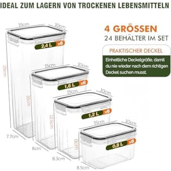 24-piece set with 4 sizes: contains 6 pieces of 0.8 L, 1.2 L, 1.6 L and 2.4 L - ideal for different storage needs. These include reusable labels. 4-sided airtight closure system: Each container has 4 side latches and a silicone sealing ring. 100% airtight and waterproof to protect against moisture and moths - preserves crispness and freshness. Food-safe and durable: Made of high-quality, BPA-free plastic. Robust, odourless and resistant from -20 °C to 100 °C (dishwasher safe, hand wash for lid is recommended). Space-saving and transparent: crystal clear containers for a full overview. The thoughtful stackable design saves valuable space in cabinet, refrigerator and pantry. Versatile uses: ideal for dry foods such as cereal, flour, pasta, coffee, but also for nuts, snacks and pet food. Your universal helper in the kitchen and household. › See more product details