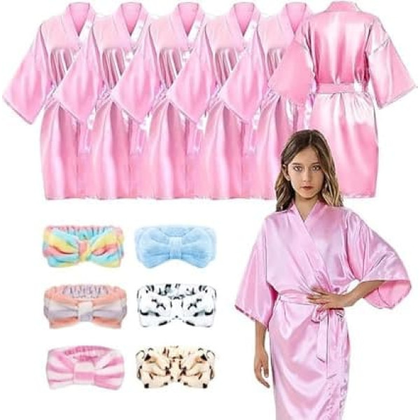 12 Pieces Spa Bathrobes for Girls, 6 Pink Satin Kimono Bathrobes with 6 Skincare Headbands for Salon, Wedding, Birthday, Party, Accessories, Size 6, 116-120, pink