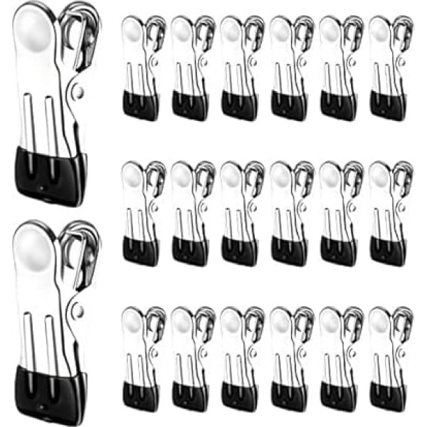HIGH QUALITY MATERIAL - Made of high quality stainless steel instead of ordinary plastic, wood or metal. Our clothespins for clothesline show greater ability in corrosion resistance, wear resistance and scratch resistance. Heavy duty waterproof rust proof clothespins can be perfectly your clothespins, sock clips, towel clips, snack clips and photo clips. Non-slip rubber coating: there is a rubber cover at the opening of the clothespins, which don't have to worry about your clothes getting snagged, torn or damaged. The rubber edges can protect your clothes from scratches, perfect for tensioning delicate fabrics or leather, and will not leave creases or marks even if clamped for a long time. Strong Clamping Force - Our clothespins are built with high quality springs with great strength, which creates a strong clamping force to firmly fix your clothes, pants, hats or socks on the clothesline or hanger, effectively prevent clothes from being blown away even in strong winds. Our clothesline pegs with reinforced steel strut make the clamping force stronger, prevent clothes from falling off. Wide Application The clothesline clothespins can be used for less than 0.94 inch thickness. These metal clothes pegs are also suitable for indoor and outdoor use. You can use our stainless steel clothespins to attach clothes, socks, towels, snacks, paper, photos in your kitchen, bathroom, office, RV, dorm room, painting room, etc. You can also use these clothespins to dry clothes outdoors on the clothesline or attach items to hangers. EASY TO CARRY - With the small, compact and lightweight design, our storm pegs are very handy and portable, especially for travelers anytime and anywhere. With just one rope, our strong clothespins allow you to dry clothes in seconds, whether you're on the go or at home, indoors or outdoors. › See more product details; Product description These metal clothes pegs are also suitable for indoor and outdoor use. You can use our stainless steel clothespins to attach clothes, socks, towels, snacks, paper, photos in your kitchen, bathroom, office, RV, dorm room, painting room, etc.; Product description These metal clothes pegs are also suitable for indoor and outdoor use. You can use our stainless steel clothespins to attach clothes, socks, towels, snacks, paper, photos in your kitchen, bathroom, office, RV, dorm room, painting room, etc.; These metal clothes pegs are also suitable for indoor and outdoor use. You can use our stainless steel clothespins to attach clothes, socks, towels, snacks, paper, photos in your kitchen, bathroom, office, RV, dorm room, painting room, etc.