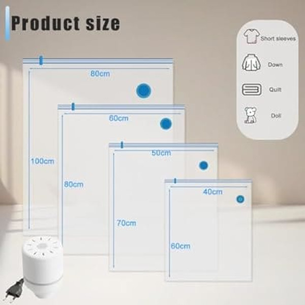 Multi-size vacuum bags for clothes: the set contains 14 vacuum bags: 2 extra large (80 x 100 cm), 3 large (60 x 80 cm), 4 medium (50 x 70 cm), 5 small (40 cm x 60 cm). 4 sizes of vacuum bags for a variety of storage needs, ideal for storing duvets, blankets, sheets, pillows, towels, clothes for different seasons and a variety of travel items. ELECTRIC VACUUM PUMP INCLUDED Our vacuum compression bag set includes a powerful 30W vacuum sealer with high suction power to quickly pump air. It can be started at the touch of a button, which saves a lot of time and effort compared to manual air pumps. SAVE 80% SPACE - With our vacuum packing bags for clothes you can optimize your storage space by 80%. Whether you are at home or on the go, vacuum travel bags allow you to pack more in less space and keep your wardrobe and suitcase neat and organized. DOUBLE SEAL PROTECTION Each bag comes with a double zipper and a physical double leak proof airlock valve. Vacuum vacuum laundry bags are effectively protected from moisture, dust, mould and insects, ensuring that your clothes stay dry and dust-free. HIGH QUALITY & REUSABLE Vacuum packaging bags are made of high quality PA and PE materials with excellent flexibility and abrasion resistance, which can withstand a variety of uses for storage, travel or movement and protect your clothes from damage. PA and PE materials are safe, odourless and reusable. The transparent vacuum bag makes it easy to identify the contents. › See more product details