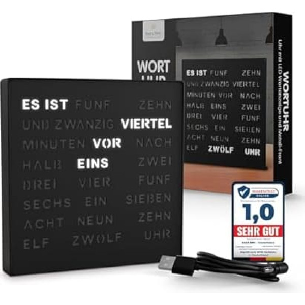 Elegant design: this extraordinary LED metal watch in an elegant design will delight you. Use it as a table or wall clock. The current time then lights up in German words (silently) and is a real eye-catcher. Flexible use: the high-quality word clock can be hung on the wall or placed on furniture such as a desk, shelf or windowsill. It is ideal as an everyday aid for the home office or as an office decoration.  Original gift idea: the stylish LED clock measures approx. 20 x 20 x 3 cm and is therefore the optimal size to integrate as a highlight into your decor. Give these to your loved ones for birthdays, housewarming, new job or Christmas. So you are guaranteed to have a suitable gift that fits many styles. Contents: you will receive a square word clock with an approx. 1.5 m long black USB cable. The clock is made of plastic, the front is made of metal in silver and comes in a beautiful gift box. The time can be set on the side with a + or - button. Our philosophy – Bada Bing stands for excellent value for money. This product is designed in Germany. We always offer you high quality at fair prices and reliable customer service. › See more product details