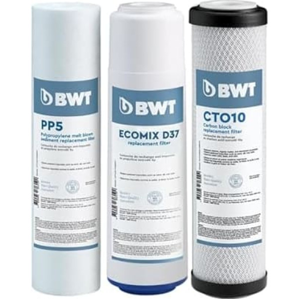 Replacement: Depending on the water quality, replacement is recommended every 3-6 months PP5 FILTER: 5 micron PP sediment filter removes particles such as mud, sand and rust larger than 5µ GAC filter: filters chlorine, chlorine by-products, natural organic substances and petrochemical substances PP1 FILTER: 1 micron PP sediment filter removes particles such as mud, sand and rust larger than 1µ › See more product details; Product description Replacement filter for BWT Standard Reverse Osmosis; Product description Replacement filter for BWT Standard Reverse Osmosis; Replacement filter for BWT Standard Reverse Osmosis