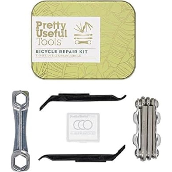 Bicycle repair kit from pretty useful tools Includes wrench, one stone, metal rasp patches, two tyre levers, hex key multifunctional tool and six glue-free Everything you need to maintain your bike while on the road Packed in this compact Sunrise yellow tin › See more product details