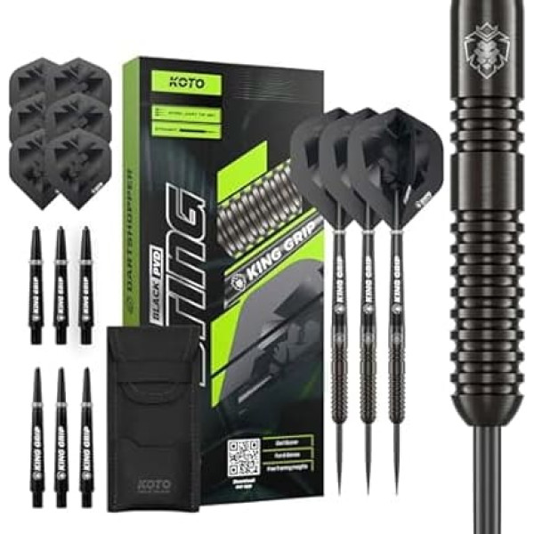 Ideal for beginners: with this complete darts set, you can be sure that you can start playing darts well. This set contains 2 sets of darts and accessories About the darts: the darts are made of high-quality brass and have a sturdy steel tip. The darts have a weight of 20 grams. These KOTO darts are blue and red. What colour do you choose? HIGH QUALITY DESIGN: These darts have a long, straight shaft, making it easy to perform your ideal throw. This allows you to practice well to get better in darts. Long pleasure: thanks to the included dart case and tip holder, you protect your darts on the go or when storing. Ideal for enjoying your KOTO Sting Black darts for as long as possible. Ideal gift: thanks to the practical and beautiful packaging in which the KOTO Sting Black darts are delivered, it is a perfect gift for friends, family - or of course for yourself. Darts are suitable for everyone › See more product details; Product description KOTO Sting Black Straight 90% Product Information: Darts Brand: KOTO Darts Material: Tungsten 90% Complete Set Darts: The KOTO Sting Black Straight 90% is delivered as a complete set. The set consists of 3 barrels, two sets of KOTO flights with logo, two sets of KOTO shafts in the size short and medium and a dart wallet with KOTO logo. SPECIFICATIONS - The darts are made of 90% high quality tungsten and are available in 3 different weights; 21, 23 and 25 grams. The dimensions of the barrels can be found in the product images. UNIQUE HANDLE The entire barrels feature a solid ring handle that has been feared with precision and gives a distinctly textured feel. This handle provides good balance so that the darts fly off gently when released. Professional: the darts are suitable for professional use, but are also a perfect birthday gift for dart lovers. KOTO: Search for \; Product description KOTO Sting Black Straight 90% Product Information: Darts Brand: KOTO Darts Material: Tungsten 90% Complete Set Darts: The KOTO Sting Black Straight 90% is delivered as a complete set. The set consists of 3 barrels, two sets of KOTO flights with logo, two sets of KOTO shafts in the size short and medium and a dart wallet with KOTO logo. SPECIFICATIONS - The darts are made of 90% high quality tungsten and are available in 3 different weights; 21, 23 and 25 grams. The dimensions of the barrels can be found in the product images. UNIQUE HANDLE The entire barrels feature a solid ring handle that has been feared with precision and gives a distinctly textured feel. This handle provides good balance so that the darts fly off gently when released. Professional: the darts are suitable for professional use, but are also a perfect birthday gift for dart lovers. KOTO: Search for \; KOTO Sting Black Straight 90% Product Information: Darts Brand: KOTO Darts Material: Tungsten 90% Complete Set Darts: The KOTO Sting Black Straight 90% is delivered as a complete set. The set consists of 3 barrels, two sets of KOTO flights with logo, two sets of KOTO shafts in the size short and medium and a dart wallet with KOTO logo. SPECIFICATIONS - The darts are made of 90% high quality tungsten and are available in 3 different weights; 21, 23 and 25 grams. The dimensions of the barrels can be found in the product images. UNIQUE HANDLE The entire barrels feature a solid ring handle that has been feared with precision and gives a distinctly textured feel. This handle provides good balance so that the darts fly off gently when released. Professional: the darts are suitable for professional use, but are also a perfect birthday gift for dart lovers. KOTO: Search for \