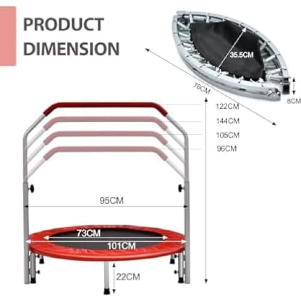 Adjustable handle for different users: Our trampoline offers a 4-way adjustable handle that can be adjusted from 96 cm to 122 cm to provide both children and adults with a safe jumping experience. Health-promoting fitness device: Our trampoline is not only a fun device, but can also help lose weight, stimulate metabolism and improve blood circulation, both in adults and children. Foldable and portable design for easy storage: with its practical design, the trampoline can be quickly folded and stored in the bag, so it can be easily taken anywhere. High-quality materials for stability and durability: the robust steel frame, the elastic PP jumping mat and the PVC cover allow a load of up to 150 kg and easy cleaning thanks to the waterproof surface. Stable and non-slip for safe jumping: with 32 high-quality springs for safety and elasticity as well as non-slip feet for a stable stand and protection of the floor from scratches, our trampoline is a safe choice for fitness and fun. › See more product details; Product description Are you still looking for fun fitness equipment? Try our trampoline! Our mini trampoline comes with a removable and adjustable foam handle, making it suitable for both children and adults. In addition, the trampoline is made of strong steel as well as PP and PVC, so it can hold up to 150 kg. And 32 springs ensure high elasticity, and the non-slip feet ensure safe and quiet use. When folded, the trampoline can be easily stored in a bag. What are you waiting for, come and buy! 5 reasons to choose our trampoline: Height-adjustable armrests are more suitable for people of different heights. With high-quality materials and a sturdy frame, it can hold up to 150 kg. Ideal for weight loss, improving balance and muscle training. With foot pads, it is quieter The foldable design makes it easy to store and transport Specifications: Colour: blue / red. Material: PP, PVC, steel, foam. Dimensions: 101 x 96/105/114/122 cm (diameter x height). Folded dimensions: 76 x 35.5 x 8 cm (L x W x H). Net weight: 10 kg. Load capacity: 150 kg. What you get: 1 x mini trampoline. 1 x carry bag. 1 x instruction manual; Product description Are you still looking for fun fitness equipment? Try our trampoline! Our mini trampoline comes with a removable and adjustable foam handle, making it suitable for both children and adults. In addition, the trampoline is made of strong steel as well as PP and PVC, so it can hold up to 150 kg. And 32 springs ensure high elasticity, and the non-slip feet ensure safe and quiet use. When folded, the trampoline can be easily stored in a bag. What are you waiting for, come and buy! 5 reasons to choose our trampoline: Height-adjustable armrests are more suitable for people of different heights. With high-quality materials and a sturdy frame, it can hold up to 150 kg. Ideal for weight loss, improving balance and muscle training. With foot pads, it is quieter The foldable design makes it easy to store and transport Specifications: Colour: blue / red. Material: PP, PVC, steel, foam. Dimensions: 101 x 96/105/114/122 cm (diameter x height). Folded dimensions: 76 x 35.5 x 8 cm (L x W x H). Net weight: 10 kg. Load capacity: 150 kg. What you get: 1 x mini trampoline. 1 x carry bag. 1 x instruction manual; Are you still looking for fun fitness equipment? Try our trampoline! Our mini trampoline comes with a removable and adjustable foam handle, making it suitable for both children and adults. In addition, the trampoline is made of strong steel as well as PP and PVC, so it can hold up to 150 kg. And 32 springs ensure high elasticity, and the non-slip feet ensure safe and quiet use. When folded, the trampoline can be easily stored in a bag. What are you waiting for, come and buy! 5 reasons to choose our trampoline: Height-adjustable armrests are more suitable for people of different heights. With high-quality materials and a sturdy frame, it can hold up to 150 kg. Ideal for weight loss, improving balance and muscle training. With foot pads, it is quieter The foldable design makes it easy to store and transport Specifications: Colour: blue / red. Material: PP, PVC, steel, foam. Dimensions: 101 x 96/105/114/122 cm (diameter x height). Folded dimensions: 76 x 35.5 x 8 cm (L x W x H). Net weight: 10 kg. Load capacity: 150 kg. What you get: 1 x mini trampoline. 1 x carry bag. 1 x instruction manual