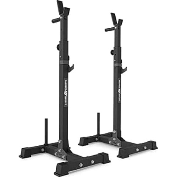 Height adjustment of the stands - You can adjust the height of the stands in a range of 103-163 cm. This allows you to perform exercises with barbells in different positions. Additional safety – safety is the key to barbell barbell. That's why our barbell racks are equipped with a well thought-out safety system. The optimal shape of the additional hooks for the barbell ensures that you will not have problems with ejecting the barbell even if you have problems with the barbell pressing. BUILT-IN DIP HANDRAILS - Sturdy dip handrails with ergonomic non-slip handles allow you to perform even a very intense push-up session with pull-ups in a stable, safe environment. Bars for storage of loads - The shelves are equipped with poles that allow you to store additional loads. This is very practical for you, because you do not have to find extra space for it. But that's not all! By placing the load on the rack, you increase its stability and thus the comfort and safety of your training. This is a good option if you have a session of heavy weights or dips in front of you. Technical data: height: min. 103 cm, maks. 163 cm; width: 45 cm; length: 54 cm; weight: 2 x 10 kg; space for weight plates: 2 pieces, diameter 25 mm, length 21 cm; weight load: 300 kg; profiles: 50 x 50 x 2 mm; material: steel; surface finish: powder coating; type of dumbbell rack: separate › See more product details