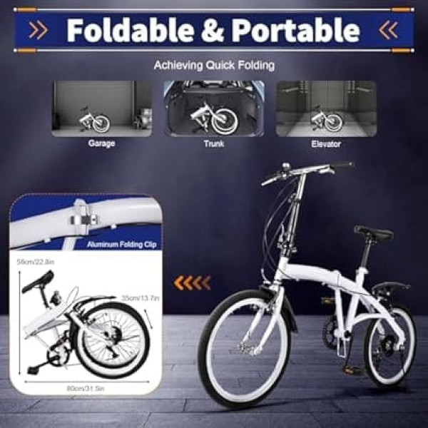 Durable and robust: the frame made of carbon steel, combined with painting and argon arc welding process, reaches a maximum load capacity of 198 pounds. High-quality rubber tyres and aluminium alloy hubs are lighter and more wear-resistant and provide good long-term performance. 【Collapsible & Portable】: It is equipped with an aluminum folding clip, which allows for quick folding. When folded, it has a size of only 31.5 x 22.8 x 13.7 inches. You can fold it up and put it in the boot of your car and take your child with you wherever they want to start an exciting ride. Adjustable design: the height of the armrests can be adjusted from 38 to 44.4 inches and the seat height from 29.5 to 36.6 inches, so that children with a height between 4.6 and 6.2 feet can comfortably ride cycles. 【Multi-speed transmission】: Six gears allow children to choose the appropriate speed according to their own needs and different environments, making driving easier. The 6-piece taren is flexible and smooth and allows stable and precise shifting in different terrain. 【Safety Protection】: Reliable front calipers and rear holding brakes ensure stable and strong stopping power even in harsh weather conditions. Non-slip tyres provide excellent grip and stability and ensure safe cycling. › See more product details; Product description Description Cycling is a great sport that can help your child stay healthy and improve their physical strength. Our foldable bike is an ideal companion for children in growth thanks to its robust, foldable frame, reliable braking system, comfortable saddle and other features, which promotes their sports skills and physical fitness. With this bike, children can ride outdoors, breathe fresh air, get closer to nature and experience more fun and excitement. Details Mudguards: both the front and rear wheels are equipped with mudguards, which effectively block water or mud splashes and keep the bike clean. Non-slip armrests: The rubber covered armrests with non-slip structure ensure a stable and comfortable grip. ENLARGED PEDALS PC pedals with larger contact area allow children to place their lower limbs more comfortably and provide a firm grip, making accidents less likely. COMFORTABLE SEAT The PU surface and foam filled pad distribute the force evenly when cycling, and the smooth, ergonomically designed design ensures high comfort even on longer rides. Application: The bike is suitable for children or adults with a height of 1.40 to 1.88 m and can be ridden on different surfaces, e.g. on uneven roads, muddy paths, meadows, mountain roads, sandy surfaces, wetlands, etc. Specifications Material: carbon steel, rubber, foam, PC, aluminium, aluminium alloy, PU Colour: white. Style: Modern Special feature: portable, foldable Surface treatment: argon arc welding, paint burning. Brakes: brake caliper brake (front), holding brake (rear). Assembly Required: Yes Number of items: 1 Number of speeds: 6. Suitable height: 1.4-1.9m/4.6-6.2ft Maximum load: 90 kg/198 lbs. Wheel size: 51 cm/20 in. Seat height adjustment: 75-93cm/29.5-36.6in Height adjustment of armrests: 97-113cm/38-44.4in Distance between armrests: 53 cm / 20.8 inches. Gross weight: 15 kg/33 lbs. Net weight: 12.65 kg / 27.8 lbs. Product size: 146 x 113 cm. Collapsible size(L*W*H): 80*58*35cm/31.5*22.8*13.7inch Package size: 87*34*63cm/34.2*13.3*24.8inch Box contents: 1 x folding bike. 1 x English assembly instructions. All accessories for assembly. Notes: 1. Please read the assembly instructions carefully and follow the steps to achieve an optimal result. Please note that there may be a slight color difference due to the lighting when shooting and 1-3cm error due to manual measurement. Make sure you agree with this before ordering.; Product description Description Cycling is a great sport that can help your child stay healthy and improve their physical strength. Our foldable bike is an ideal companion for children in growth thanks to its robust, foldable frame, reliable braking system, comfortable saddle and other features, which promotes their sports skills and physical fitness. With this bike, children can ride outdoors, breathe fresh air, get closer to nature and experience more fun and excitement. Details Mudguards: both the front and rear wheels are equipped with mudguards, which effectively block water or mud splashes and keep the bike clean. Non-slip armrests: The rubber covered armrests with non-slip structure ensure a stable and comfortable grip. ENLARGED PEDALS PC pedals with larger contact area allow children to place their lower limbs more comfortably and provide a firm grip, making accidents less likely. COMFORTABLE SEAT The PU surface and foam filled pad distribute the force evenly when cycling, and the smooth, ergonomically designed design ensures high comfort even on longer rides. Application: The bike is suitable for children or adults with a height of 1.40 to 1.88 m and can be ridden on different surfaces, e.g. on uneven roads, muddy paths, meadows, mountain roads, sandy surfaces, wetlands, etc. Specifications Material: carbon steel, rubber, foam, PC, aluminium, aluminium alloy, PU Colour: white. Style: Modern Special feature: portable, foldable Surface treatment: argon arc welding, paint burning. Brakes: brake caliper brake (front), holding brake (rear). Assembly Required: Yes Number of items: 1 Number of speeds: 6. Suitable height: 1.4-1.9m/4.6-6.2ft Maximum load: 90 kg/198 lbs. Wheel size: 51 cm/20 in. Seat height adjustment: 75-93cm/29.5-36.6in Height adjustment of armrests: 97-113cm/38-44.4in Distance between armrests: 53 cm / 20.8 inches. Gross weight: 15 kg/33 lbs. Net weight: 12.65 kg / 27.8 lbs. Product size: 146 x 113 cm. Collapsible size(L*W*H): 80*58*35cm/31.5*22.8*13.7inch Package size: 87*34*63cm/34.2*13.3*24.8inch Box contents: 1 x folding bike. 1 x English assembly instructions. All accessories for assembly. Notes: 1. Please read the assembly instructions carefully and follow the steps to achiev