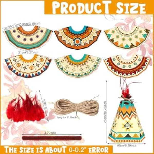 What You Get Your package comes with 24 own teepee crafts in 6 styles, along with a bundle of accessories such as 96 pipe cleaners and 72 red feathers and hemp rope. The Native American month craft kit contains 6 different styles for children's teepee tents, expanding the possibilities of creativity, improving your child's cognitive skills. can create the festive atmosphere HIGH QUALITY MATERIAL Made of high quality paper material, our teepee craft kits for kids are durable and long lasting. This ensures that your child's handmade teepee creations stand up to the time and hearty enthusiasm of playful little hands. Our teepee crafts measuring 26 x 16 cm ensure comfortable use for little hands, making them an ideal choice for tea pis crafts for kids EASY DIY FUN These DIY teepee crafts are not just crafts, they are possibilities for endless fun. Our Native American months craft kits are designed for easy DIY fun, allowing children to channel their inner craftsmen. Children can use 4 pipe cleaners, 3 feathers, 1 string to make 1 unique Indian teepee tent EXCEPTIONAL EDUCATIONAL TOYS More than just pretty teepee crafts for kids, these Native American teepee sets also serve an educational purpose. They offer children a nice opportunity to train their creativity, improve fine motor skills and learn more about the culture and history associated with tea pis Wide Application Our teepee art project is suitable for a variety of uses. They serve as beautiful teaching tools in schools, fantastic decorative items at themed parties, or just as a great DIY activity for Native American Month, Heritage Month. Their versatility therefore makes them the ideal gift due to its countless uses › See more product details; Product description Product Features: MULTIPURPOSE Our Native American craft kits are an ideal gift for various occasions such as Native American month, birthdays, Halloween, celebrating beautiful culture, arts and crafts day or a creative camp tent project. The vibrant multi-coloured paper appeals to children's aesthetics and encourages them to explore their artistic side. STUNNING CRAFTSMANSHIP: Watch your kids turn plain paper into stunning tea pises. The variety of colours and patterns in the set paves the way for beautiful tent crafts. Enjoy the joy of seeing your child's proud smile when they show off their DIY teepee craft. Product Features: Main material: paper. Main Color: Multicolor Size: 26 x 16 cm (H x W). Package includes: 24 x Make your own teepee. Notes: Manual measurement, please allow slight errors on size. The color may exist slight difference due to different displays.; Product description Product Features: MULTIPURPOSE Our Native American craft kits are an ideal gift for various occasions such as Native American month, birthdays, Halloween, celebrating beautiful culture, arts and crafts day or a creative camp tent project. The vibrant multi-coloured paper appeals to children's aesthetics and encourages them to explore their artistic side. STUNNING CRAFTSMANSHIP: Watch your kids turn plain paper into stunning tea pises. The variety of colours and patterns in the set paves the way for beautiful tent crafts. Enjoy the joy of seeing your child's proud smile when they show off their DIY teepee craft. Product Features: Main material: paper. Main Color: Multicolor Size: 26 x 16 cm (H x W). Package includes: 24 x Make your own teepee. Notes: Manual measurement, please allow slight errors on size. The color may exist slight difference due to different displays.; Product Features: MULTIPURPOSE Our Native American craft kits are an ideal gift for various occasions such as Native American month, birthdays, Halloween, celebrating beautiful culture, arts and crafts day or a creative camp tent project. The vibrant multi-coloured paper appeals to children's aesthetics and encourages them to explore their artistic side. STUNNING CRAFTSMANSHIP: Watch your kids turn plain paper into stunning tea pises. The variety of colours and patterns in the set paves the way for beautiful tent crafts. Enjoy the joy of seeing your child's proud smile when they show off their DIY teepee craft. Product Features: Main material: paper. Main Color: Multicolor Size: 26 x 16 cm (H x W). Package includes: 24 x Make your own teepee. Notes: Manual measurement, please allow slight errors on size. The color may exist slight difference due to different displays.