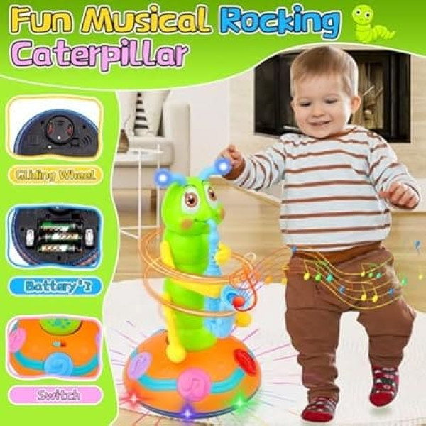 Dancing Saxophone Caterpillar: Our adorable electric dancing caterpillar toy moves its body, hands and feet while playing music. The electric saxophone caterpillar has bright colors, cute facial expressions and flashing lights. The rocking dance toy Twister plays saxophone and dances to music. It can play 6 beautiful songs and is an enchanting and entertaining companion that brings joy and laughter to children of all ages. Durable material and colourful light: the dancing saxophone caterpillar is made of plastic and can be used for a long time. Approximate product size: 24.5 x 14 x 14 cm. Fine workmanship, clean lines and exquisite products will please you. The main body and base of the dancing caterpillar emit vibrant and colourful lights, making it visually appealing especially in dimly lit rooms. The LED lights provide extra tension when playing. 2 game modes: the electric caterpillar caterpillar has two modes, the light mode and the dance mode. Slide the light mode switch to the first position, and the colourful lights on the body and base of the caterpillar flash. Charming lights attract children's attention. Slide the switch to the second position to switch to dance mode. The caterpillar toy sways and dances with the lights and sounds. Catterpiller dance toy: With this musical swing caterpillar toy, your child can explore different movements and patterns, promoting their creativity and imagination. The funny caterpillar music toy can sing and wiggle, and it can attract your little children's attention and awaken their curiosity. While children dance to the caterpillar or squirm, the toy also promotes their hand-eye coordination and concentration. Perfect gift idea: With its bright colours and impeccable craftsmanship, this musical saxophone caterpillar sensory toy is an ideal birthday or Christmas gift for boys and girls. The Twister swing dance toy is a learning tool that helps them develop their motor skills, coordination and creativity. Let your child explore the world of music and have fun with this captivating toy. › See more product details; Product description Product description Special feature: Your child will enjoy this electric caterpillar saxophone toy that plays and dances 6 pieces of music. Besides, it can rotate its body, hands and feet in line with the music, making it more vivid and musical. In light mode, press the switch to witness a fascinating display of colourful lights. Switch to dance mode, and the dancing, singing caterpillar comes to life with delightful movements and dances, accompanied by enchanting sounds. For endless entertainment, children can switch between modes. This music caterpillar saxophone toy for children offers children unlimited imagination. Use them to create magical collaborations and more endless possibilities. Funny electric music toy fidget caterpillar is a perfect accessory for home decoration and parties, creating a lively and warm atmosphere. Specification: Material: plastic. Colour: multi-coloured. Type: Caterpillar Size: 24.5 x 14 x 14 cm. Weight: 446 g Package includes: 1 x Caterpillar saxophone toy. Please note: Due to the light and screen difference, the item's color may be slightly different from the pictures. Please allow some differences due to manual measurement. Thank you for your understanding. Directions Drücken Sie den Schalter auf die erste Position, um den Lichtmodus zu aktivieren, wodurch die bunten Lichter am Körper und am Boden der Raupe blinken. Drücken Sie den Schalter auf die zweite Position, um den Tanzmodus zu aktivieren, wodurch die Raupe mit den Lichtern und Geräuschen tanzen lässt. Safety Warning To be used under the direct supervision of an adult. See more; Product description Product description Special feature: Your child will enjoy this electric caterpillar saxophone toy that plays and dances 6 pieces of music. Besides, it can rotate its body, hands and feet in line with the music, making it more vivid and musical. In light mode, press the switch to witness a fascinating display of colourful lights. Switch to dance mode, and the dancing, singing caterpillar comes to life with delightful movements and dances, accompanied by enchanting sounds. For endless entertainment, children can switch between modes. This music caterpillar saxophone toy for children offers children unlimited imagination. Use them to create magical collaborations and more endless possibilities. Funny electric music toy fidget caterpillar is a perfect accessory for home decoration and parties, creating a lively and warm atmosphere. Specification: Material: plastic. Colour: multi-coloured. Type: Caterpillar Size: 24.5 x 14 x 14 cm. Weight: 446 g Package includes: 1 x Caterpillar saxophone toy. Please note: Due to the light and screen difference, the item's color may be slightly different from the pictures. Please allow some differences due to manual measurement. Thank you for your understanding. Directions Drücken Sie den Schalter auf die erste Position, um den Lichtmodus zu aktivieren, wodurch die bunten Lichter am Körper und am Boden der Raupe blinken. Drücken Sie den Schalter auf die zweite Position, um den Tanzmodus zu aktivieren, wodurch die Raupe mit den Lichtern und Geräuschen tanzen lässt. Safety Warning To be used under the direct supervision of an adult. See more; Product description Special feature: Your child will enjoy this electric caterpillar saxophone toy that plays and dances 6 pieces of music. Besides, it can rotate its body, hands and feet in line with the music, making it more vivid and musical. In light mode, press the switch to witness a fascinating display of colourful lights. Switch to dance mode, and the dancing, singing caterpillar comes to life with delightful movements and dances, accompanied by enchanting sounds. For endless entertainment, children can switch between modes. This music caterpillar saxophone toy for children offers children unlimited imagination. Use them to create magical collabora