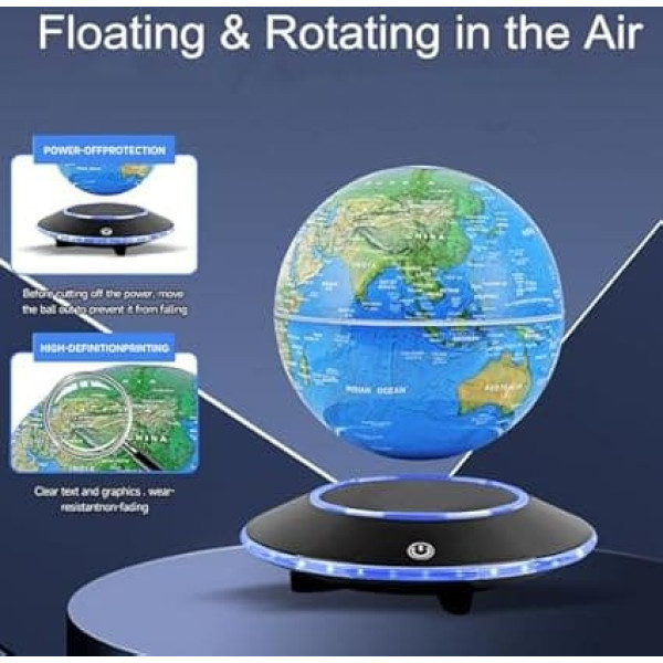 Magnetic Floating Design The magnetic floating globe is held in the air by magnetic technology. The floating globe rotates gently 360 degrees and glows quietly. Automatic Rotation The floating globe can continuously rotate 360 degrees and work silently. Once the rotation has started, the magnetic globe stops only when it is bumped or turned off. The floating globe is automatically adsorbed to the base when switched off, effectively protecting it. 7 Color Changing LED Ball: Built-in LED Lights When the device is turned on, the base lights up blue. When the ball floats successfully, the floating ball lights up and shows a multi-coloured changing light. Touch Control You can touch the on/off switch icon on the base to turn the moon lamp or base light on or off separately. The magnetic floating world globe provides a beautiful display effect and is perfect for your office, home or desk decoration. The text graphics of the world globe are clear and clear, making it a great tool for learning geographical knowledge. It looks very original and cool and is ideal as a gift for family and friends. › See more product details; Product description Floating Globe; Product description Floating Globe; Floating Globe