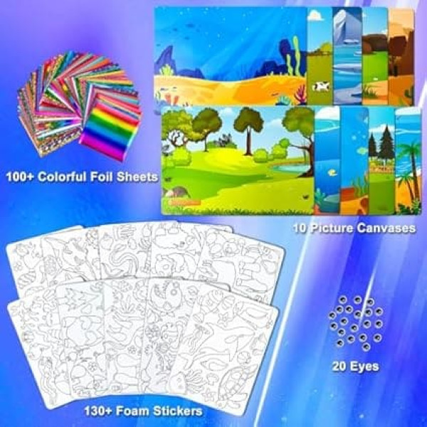 FUN & CRAFT Kids can create colorful artwork by simply pressing aluminum foil on foam stickers, encouraging creativity and imagination. Easy to Use This foil DIY kit is specially designed for young children. The foam stickers and aluminium foil are safe and can be easily removed and pressed by the children themselves. INCLUDES EVERYTHING YOU NEED Includes 100+ foil sheets, 100 colorful foil sheets, 10 picture canvases, wiggly eyes that allow kids to create colorful designs and craft personalized foil toys for endless fun and creative expression. Educational and engaging: When children press the foil onto the foam stickers, they develop fine motor skills, hand-eye coordination and problem solving skills in a playful way. PERFECT FOIL FUN FOR YOUNG CRAFTERS This craft kit is great for birthdays, holidays or just as a fun weekend activity and makes an excellent gift for kids who love arts and crafts. › See more product details