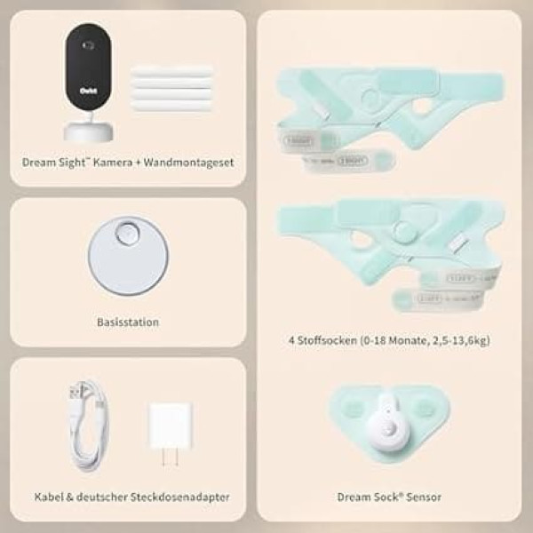 Precise Dream Sock Sensor: Gently measures your baby's heart rate, oxygen levels & sleep trends in real time. Secure transmission: Encrypted data & reliable connection for maximum privacy. 2K HD camera with night vision: Cry & Motion alerts, room temperature & humidity in view. Smart App Control: All values and notifications directly to your smartphone. Complete Monitoring Kit: Dream Sock, Camera, Charging Dock, Wall Mount & App - Ready to Use › See more product details