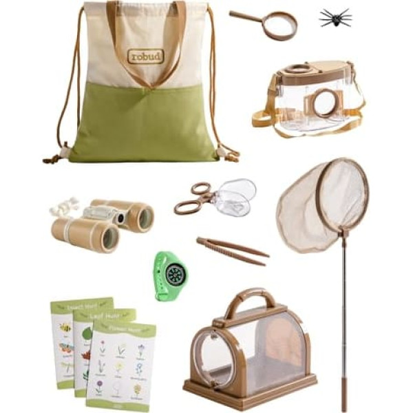 ROBUD Outdoor Explorer Kit for Kids, 12PCS Bug Catching Adventure Set with Kids Binoculars, Compass Watch, Butterfly Net, Magnifying Glass, Gift Toys for Ages 3-12, Green