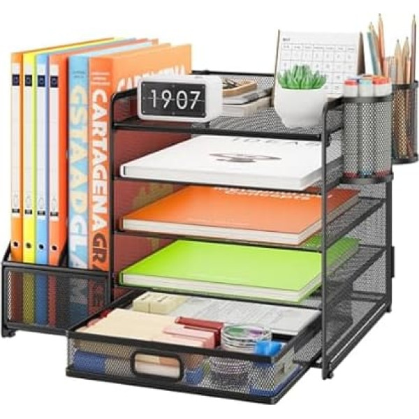 Premium: The desk organiser is made of high-quality and durable metal mesh and is reinforced with a robust steel frame for durability. Space-saving: the office organiser offers you plenty of storage space for sorting, 5 sliding compartments, 2 magazine files and 2 pen holders, which are convenient for storing diaries, bills, documents and books. Make the most of the space and help quickly identify the contents of each compartment, which greatly improves your work efficiency. Easy to assemble: No additional tools are required for the screwless file holder, according to the installation instructions, you will receive a beautiful and durable letter tray in 1 minute. Modern aesthetic design: the robust steel frame structure enhances the feeling of line and fashionable beauty. So you not only keep your work area organised, but also add a touch of elegance to your office or home decor. Customer service: Our professional customer service team offers you professional advice before sale and customer service. If you encounter any problems when using our products, please contact us and we will contact you immediately. › See more product details