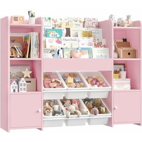 Order in the children's room: the pink children's shelf (119 x 29.5 x 94 cm) offers you generous storage space for easy sorting. Photo frames, lamps, alarm clocks etc. can be placed on the table top. 4 open compartments allow you to easily sort and access. So you have plenty of space to organise dolls, stationery, clothes and much more. 6 toy boxes provide plenty of space for storing building blocks, toys, dolls, toy cars or other small items. The compartment with door is dustproof and suitable for clothes. The multifunctional children's cabinet provides more clarity in the children's room. The bookcase for children: the children's cabinet has 4 shelves on which your child's books, picture books, photo albums etc. find their ideal place. The tiered design brings out the book covers well. In this way, your child can easily find the books they need. This helps children recognise colours and patterns. Each shelf is about 18 cm deep and is suitable for books of different sizes. Each shelf can hold 5 kg (5-10 books). The bookcase is about 60 cm above the floor, so your child can easily reach the books. Safety & Stability: The bookcase for children is equipped with 2 anti-tilt locks. We recommend that you attach the shelf to the wall with the tilt protection so that it is more stable and safe. The top corners are rounded to avoid accidental scratches. The metal poles that carry the toy boxes can hold up to 15 kg per level. This nursery furniture can be used as children's cabinet, bookcase, toy cabinet, children's wardrobe and so on. The pink cute appearance makes it suitable for any style in your children's room. It can be placed in the children's room, study, living room, hallway, nurseries, schools Durable Kids Cabinet Made of High Quality Material The toy cabinet is made of wood materials with good load capacity. The table top can hold up to 20 kg, each compartment 10 kg, each box 5 kg. The cabinet has no bad smell. The surface has been carefully polished, so it is very smooth and burr-free. So children can use it without worry EASY ASSEMBLY All parts are included in 1 packages. The children's shelf is assembled by you. But don't worry, we provide detailed assembly instructions with text and graphic instructions and all accessories required for assembly. They help you perform the assembly quickly and correctly › See more product details