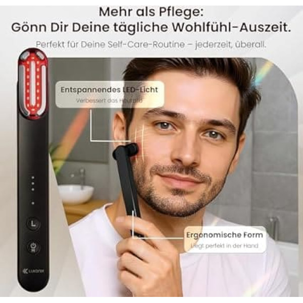 5-in-1 Light Therapy Light Therapy for Modern Skin Care: Combines red light, blue light and purple light with EMS microcurrent EMS device, vibration and heat function - for smoother skin, facial massager against wrinkles and improved skin texture Targeted EMS light treatment: red light (630-660 nm) supports cell regeneration and reduces wrinkles. Blue light (470 nm) clarifies the complexion and has an antibacterial effect. Purple light balances and supports skin balance Ergonomic with 90° rotating head face massager: the flexible head of the electric face massager reaches all areas of the face comfortably. The face massager is ideal for jaw line, forehead and cheeks - comfortable, efficient and precise. EMS device face & EMS technology: micro-current activates the skin muscles, while vibrations stimulate blood circulation and care products such as serums and creams are better absorbed for noticeably firmer skin. Stimulates facial muscles. Lightweight, portable and rechargeable: for home and travel. Only 100 g weight, wireless with up to 180 minutes of battery life. Your compact Red Light Therapy device for daily facial care. Your red light lamp face is ready to use anywhere. › See more product details