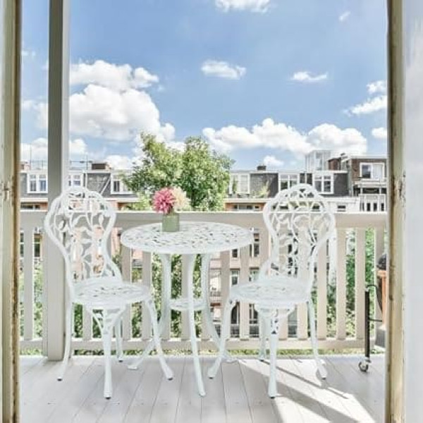 3 pieces: garden furniture set with round patio table and 2 garden chairs - for relaxing hours Nostalgic: white balcony furniture set with decorative leaf pattern - balcony set in French style Stable: robust garden furniture made from powder-coated cast aluminium - chairs with adjustable feet Outdoor: Stylish bistro set as an eye-catcher outdoors - ideal for garden, terrace and porch Compact: balcony furniture for 2 people - table H x D: approx. 65 x 61 cm. Chair H x W x D: approx. 86 x 41 x 47 cm › See more product details
