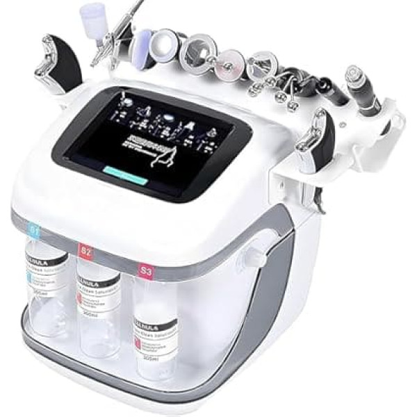 Hydrogen and oxygen face treatment: Our hydrogen and oxygen bladder beauty device has 10 carefully developed attachments that are tailored to the different needs of your skin and help you effectively solve different skin problems. Skin cleaning: say goodbye to impurities, stubborn blackheads and excess oil. Our Hydro Facial Device harnesses the power of advanced suction and cleansing technology to penetrate deep into your pores and remove dirt, debris and pollutants effortlessly. Moisture supply: Experience instant and direct moisture supply for your skin. The moisturising function of our device pampers your skin with an abundance of water molecules, instantly quenches its thirst and restores its natural moisture balance. Nutrient introduction: the insertion head opens the pores so that the ingredients of the sewing resence can quickly penetrate the basal layer of the skin. Up to 90% of nutrients are absorbed. The device soothes the skin, cools it quickly, reduces pores and prevents loss of moisture. Easy to use: the Hydro Facial device has a brilliant colour display and is therefore very easy to use. Thanks to the user-friendly interface, you can unlock the full potential of the device, even as a first-time user. › See more product details; Product description The 10-in-1 multifunctional device cleanses the skin deep into the pores, effectively promotes skin metabolism, quickly removes melanin, improves a pale complexion and dry skin, ensures an even complexion, provides intensive moisture and makes the skin shine. Specifications: Outer material: ABS Operating voltage: AC 100-240V Liquid bottle: S1/S2/S3 solution bottle. Power: 450 W. Oxygen bubble head: oxygen bubble head. Display size: 8 inches. Remote control: wired Smart timer: independently adjustable. Dimensions: 28 x 40 x 42 cm. Weight: 9 kg. Functions: --- Bubble Head: Creates a vacuum and uses negative pressure to remove impurities and cleanse the skin. --- Airbrush: High pressure oxygen injection for intensive moisturising, which penetrates deep into the skin and allows absorption through fine pores. ---Wave head (face + eyes): introduces care products for better absorption, refines pores and ensures smooth and delicate skin. ---Eye Head: Reduce, tighten and lift fine lines around the eyes. ---Hot and cold head: narrows the skin. Pores are cleaned, nutrient blockages are released and the skin soothes and repaired. --Oxygen Bladder Pen: This magic oxygen bladder pen cleans deep pores and provides the skin with dirt and oxygen. It cleans your face while nourishing your whole body. Package includes: 1 x 10-in-1 Hydrogen Oxygen Facial Cleanser; Product description The 10-in-1 multifunctional device cleanses the skin deep into the pores, effectively promotes skin metabolism, quickly removes melanin, improves a pale complexion and dry skin, ensures an even complexion, provides intensive moisture and makes the skin shine. Specifications: Outer material: ABS Operating voltage: AC 100-240V Liquid bottle: S1/S2/S3 solution bottle. Power: 450 W. Oxygen bubble head: oxygen bubble head. Display size: 8 inches. Remote control: wired Smart timer: independently adjustable. Dimensions: 28 x 40 x 42 cm. Weight: 9 kg. Functions: --- Bubble Head: Creates a vacuum and uses negative pressure to remove impurities and cleanse the skin. --- Airbrush: High pressure oxygen injection for intensive moisturising, which penetrates deep into the skin and allows absorption through fine pores. ---Wave head (face + eyes): introduces care products for better absorption, refines pores and ensures smooth and delicate skin. ---Eye Head: Reduce, tighten and lift fine lines around the eyes. ---Hot and cold head: narrows the skin. Pores are cleaned, nutrient blockages are released and the skin soothes and repaired. --Oxygen Bladder Pen: This magic oxygen bladder pen cleans deep pores and provides the skin with dirt and oxygen. It cleans your face while nourishing your whole body. Package includes: 1 x 10-in-1 Hydrogen Oxygen Facial Cleanser; The 10-in-1 multifunctional device cleanses the skin deep into the pores, effectively promotes skin metabolism, quickly removes melanin, improves a pale complexion and dry skin, ensures an even complexion, provides intensive moisture and makes the skin shine. Specifications: Outer material: ABS Operating voltage: AC 100-240V Liquid bottle: S1/S2/S3 solution bottle. Power: 450 W. Oxygen bubble head: oxygen bubble head. Display size: 8 inches. Remote control: wired Smart timer: independently adjustable. Dimensions: 28 x 40 x 42 cm. Weight: 9 kg. Functions: --- Bubble Head: Creates a vacuum and uses negative pressure to remove impurities and cleanse the skin. --- Airbrush: High pressure oxygen injection for intensive moisturising, which penetrates deep into the skin and allows absorption through fine pores. ---Wave head (face + eyes): introduces care products for better absorption, refines pores and ensures smooth and delicate skin. ---Eye Head: Reduce, tighten and lift fine lines around the eyes. ---Hot and cold head: narrows the skin. Pores are cleaned, nutrient blockages are released and the skin soothes and repaired. --Oxygen Bladder Pen: This magic oxygen bladder pen cleans deep pores and provides the skin with dirt and oxygen. It cleans your face while nourishing your whole body. Package includes: 1 x 10-in-1 Hydrogen Oxygen Facial Cleanser