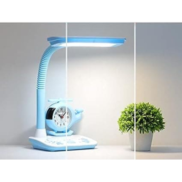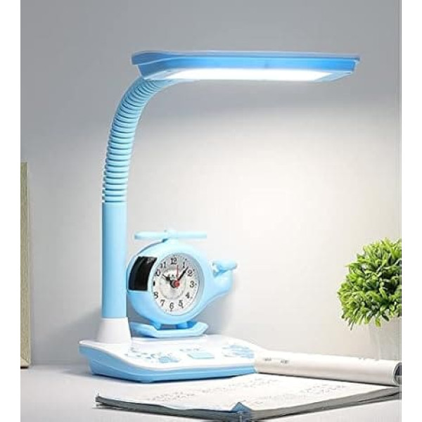 LED Children's Desk Lamp Table Lamp with Clock Cartoon Adjustable Reading Lamp Bedroom Bedside Lamp Button Switch Three Colours Dimming for Office Students Eye Protection Lamp Blue