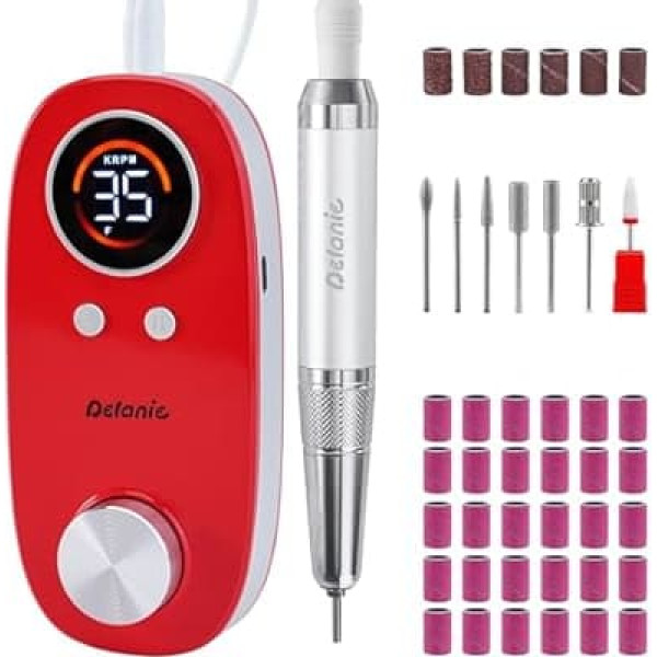 Delanie Professional Nail Drill Bit 35000RPM Cordless Rechargeable 5000mAh with Bonton Pause for Manicure Pedicure Red