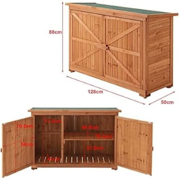 Optimal solution to keep your garden utensils weatherproof. With an additional shelf inside the cabinet - 2 doors that are closed with a latch - Raised stand on feet protects against soil moisture - Water-repellent roof covered with bitumen - Suitable for outdoor use - Easy installation Dimensions: total (H x W x D): 88 x 128 x 50 cm. Internal dimensions (H x W x D): 71.2 x 113 x 41 cm. Shelf (W x D): 76.3 x 40.5 cm. Distance from cabinet floor to shelf: 31.5 cm. Cabinet door (H x W): 70.5 x 56 cm Material: appliance cabinet: fir wood, roof: bitumen, colour: natural Branded product from the house: [en.casa] › See more product details