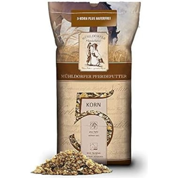 Variety, naturalness and the highest whole grain quality: Mühldorfer 5-Korn Plus offers a natural, diverse and well-tolerated blend without pellets, which is well accepted by horses Rich in inulin due to fermented Jerusalem artichoke: the addition of fermented Jerusalem artichoke with high inulin content promotes a healthy intestinal flora and supports digestion Natural composition without additives: 5-grain plus horse food is free from chemical binders, extractants and preservatives, for natural and healthy horse feeding Nutrient-friendly processing for maximum vital material absorption: thanks to the particularly gentle processing, organically bound vital substances are largely retained, which allows optimal absorption in the horse organism The pellet-free and particularly balanced horse muesli contains specially developed cereals such as barley, corn, linseed, sunflower seeds and the primordial emmmer › See more product details; Product description Product Description The Mühldorfer 5-grain plus oat-free is an oat-free all-round talent for all leisure and sports horses. To ensure an extensive supply of essential vitamins, minerals and trace elements, Mühldorfer 5-Korn Plus contains mineralisation and vitaminisation in addition to the organically bound vital substances of native origin. Due to the differentiated digestion of the grain in 5-grain plus, the energy is provided periodically after feed intake (short, medium, long-term). Ingredients: barley / corn (popped, rolled) / sugar beet syrup / sunflower seeds / flax seeds / calcium carbonate / emmmer / Jerusalem artichoke (fermented) / sodium chloride (salt) / sodium bicarbonate / wheat bran / magnesium oxide / monocalcium phosphate. Feeding recommendation: 1-3kg per day according to your needs and performance requirements. This supplementary feed may only be fed according to the feeding recommendations given here because of the higher levels of vitamins and trace elements compared to complete feed. Indications All ages, recreational horses Ingredients 45.00% barley (toasted, rolled), 42.00% corn (popbed, rolled), 3.50% sugar beet syrup, 3.00% sunflower seeds, 1.00% emmer, 2.00% linseed, 0.50% Jerusalem artichoke concentrate, Calcium carbonate, Sodium bicarbonate, sodium chloride, magnesium oxide, monocalcium phosphate. Directions 1-3 kg per day, depending on your needs and performance requirements Box Contains 20 kg See more; Product description Product Description The Mühldorfer 5-grain plus oat-free is an oat-free all-round talent for all leisure and sports horses. To ensure an extensive supply of essential vitamins, minerals and trace elements, Mühldorfer 5-Korn Plus contains mineralisation and vitaminisation in addition to the organically bound vital substances of native origin. Due to the differentiated digestion of the grain in 5-grain plus, the energy is provided periodically after feed intake (short, medium, long-term). Ingredients: barley / corn (popped, rolled) / sugar beet syrup / sunflower seeds / flax seeds / calcium carbonate / emmmer / Jerusalem artichoke (fermented) / sodium chloride (salt) / sodium bicarbonate / wheat bran / magnesium oxide / monocalcium phosphate. Feeding recommendation: 1-3kg per day according to your needs and performance requirements. This supplementary feed may only be fed according to the feeding recommendations given here because of the higher levels of vitamins and trace elements compared to complete feed. Indications All ages, recreational horses Ingredients 45.00% barley (toasted, rolled), 42.00% corn (popbed, rolled), 3.50% sugar beet syrup, 3.00% sunflower seeds, 1.00% emmer, 2.00% linseed, 0.50% Jerusalem artichoke concentrate, Calcium carbonate, Sodium bicarbonate, sodium chloride, magnesium oxide, monocalcium phosphate. Directions 1-3 kg per day, depending on your needs and performance requirements Box Contains 20 kg See more; Product Description The Mühldorfer 5-grain plus oat-free is an oat-free all-round talent for all leisure and sports horses. To ensure an extensive supply of essential vitamins, minerals and trace elements, Mühldorfer 5-Korn Plus contains mineralisation and vitaminisation in addition to the organically bound vital substances of native origin. Due to the differentiated digestion of the grain in 5-grain plus, the energy is provided periodically after feed intake (short, medium, long-term). Ingredients: barley / corn (popped, rolled) / sugar beet syrup / sunflower seeds / flax seeds / calcium carbonate / emmmer / Jerusalem artichoke (fermented) / sodium chloride (salt) / sodium bicarbonate / wheat bran / magnesium oxide / monocalcium phosphate. Feeding recommendation: 1-3kg per day according to your needs and performance requirements. This supplementary feed may only be fed according to the feeding recommendations given here because of the higher levels of vitamins and trace elements compared to complete feed. Indications All ages, recreational horses Ingredients 45.00% barley (toasted, rolled), 42.00% corn (popbed, rolled), 3.50% sugar beet syrup, 3.00% sunflower seeds, 1.00% emmer, 2.00% linseed, 0.50% Jerusalem artichoke concentrate, Calcium carbonate, Sodium bicarbonate, sodium chloride, magnesium oxide, monocalcium phosphate. Directions 1-3 kg per day, depending on your needs and performance requirements Box Contains 20 kg See more