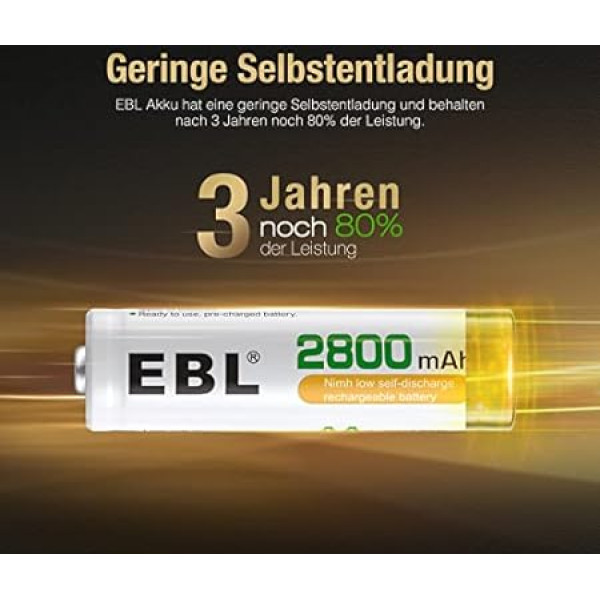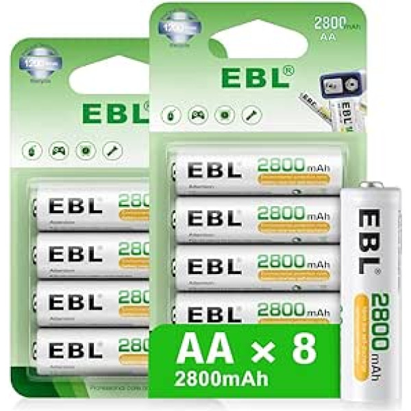 EBL AA battery with high performance, no longer worry about the endurance of the battery. 2800 mAh AA battery will provide strong performance and longer running time for your devices. Mignon AA battery 2800 mAh: high capacity and fast charging – ideal for power-intensive devices such as torch, model making, electronic tools, smoke detector, LED lights, digital camera, toys, hand games, radios, PDA, alarm clock, LCD TV, wireless computer mice ProCyco (Professional recycle) helps maximise the best performance during charging. EBL batteries are robust against overcharging and deep discharge and are characterised by high cycles and durability. Thanks to the high capacity, the micro batteries still have capacity after transport and are therefore ready to use immediately if you need to go quickly. Low self-discharge can still retain 80% of full capacity after 3 years without use. Heat and cold resistant from -20°C to +65°C. 1.2 V Ni-MH battery, rechargeable Ni-Mh micro battery batteries without memory effect, contains no pollution such as Hg/Cd/Pb.