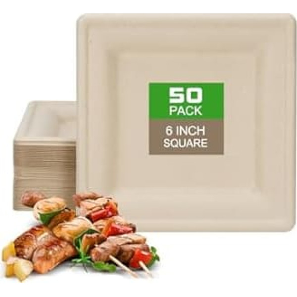 CVIUYO Super Rigid Heavy Duty 100% Compostable Disposable Plates Square Natural Unbleached Sugarcane Bagasse Heavy Duty Tray Microwave Safe 50 Pack (6")