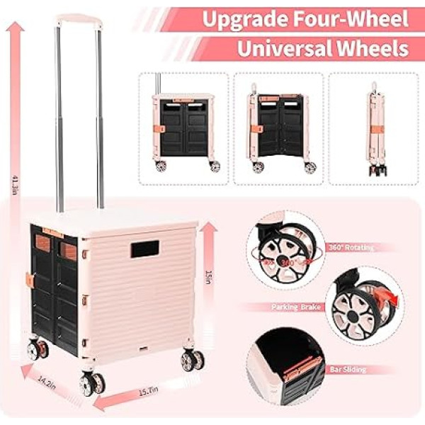 High-quality materials: This folding trolley is made of a robust and durable housing made of high-quality polypropylene with rust-resistant aluminium alloy handle (ultra-light) and wear-resistant and pressure-resistant TPE rubber wheels that feature flexible rotation and good cushioning performance. It is suitable for different surfaces and people, including blind roads, uneven sandstone ground etc. Long practical service life Intelligent and simple: this trolley is equipped with four removable 360° rotating silent wheels that can easily change the direction when used. Two rear wheels with brake buttons can prevent the trolley from slipping when not in use. The wheels can also be easily removed and replacement is easy! The trolley has a lid to ensure safety and does not get wet in the rain Space-saving: With the ergonomic, space-saving, flat folding design, you only need to open the shopping trolley and slide the mounting rod to turn it into a storage box. Slide the mounting rod to fold again so you can store it more easily. The box with wheels can also be easily removed for cleaning Portable and practical: the shopping cart is versatile and an indispensable part of life. The luggage trolley folds easily in seconds. The size is 44 × 40 × 8.5 cm, which saves more space and is a lighter weight. It can be easily carried in a backpack or according to your actual needs. The height of the handle can also be adjusted. You can adjust it to your desired height and it feels very good Versatile use: this trolley offers a good deal of storage space and supports 50 kg. It can store food, documents, books, office supplies, food and drinks, sporting goods and tools. It offers you a wide range of uses and is perfect for home, office, business, shopping, travel, hiking, camping, picnic, festival and home projects