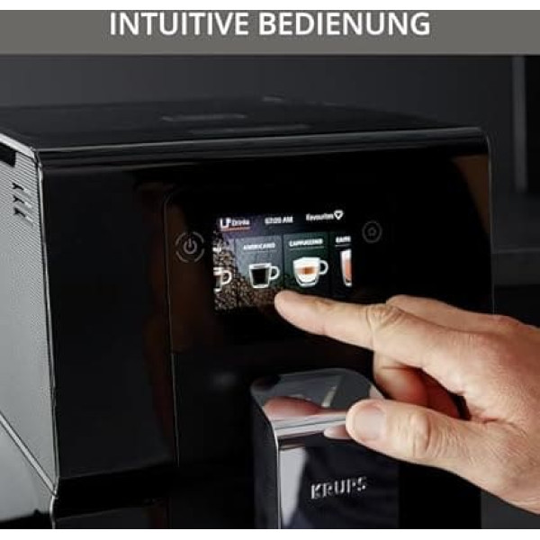 Intuitive operation: the display can be operated like a smartphone, personalised light display in colour simplifies operation and navigation Drinks: this coffee machine can prepare ristretto, espresso, long coffee, Americano, lungo, cappuccino, latte macchiato, caffè latte, milk foam and hot water for tea Extensive personalisation: this fully automatic coffee machine allows you to store up to eight favourite drinks No plastic brewing group: all coffee machines from Krups are equipped with a durable metal brewing unit that ensures the best heat conduction Fully automatic cleaning: thanks to the closed brewing system, cleaning is effortless with a cleaning tab – without the risk of incorrect operation TÜV hygiene certificate: the independent international laboratory TÜV Rheinland has certified the microbiological safety of this fully automatic coffee machine, the automatic cleaning of the brewing group is flawless Made in France: this fully automatic coffee machine has been developed and manufactured in France