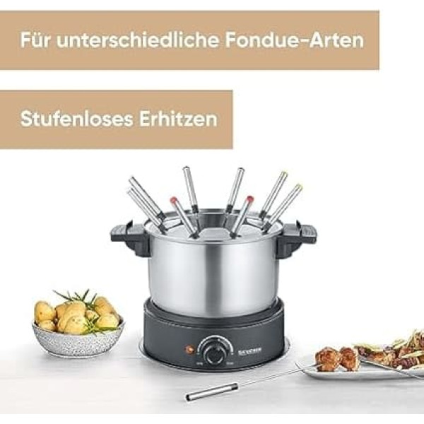 All fondue types - whether on holidays, special occasions or simply in between, with the fondue set from Severin you can enjoy cheese, meat or chocolate fondue 8 different forks - The fondue set has 8 colour-coded fondue forks for optimal identification and a removable splash guard with locking device Comfortable handling - The electric fondue pot is removable and is heated with the continuous thermostat when used Extra long cable provides more flexibility Easy to clean - Since all removable parts are dishwasher safe, the cheese fondue set is particularly easy to clean and annoying rinsing is saved Details - Severin electric fondue set made of stainless steel with 8 colour-coded forks and removable splash guard, dishwasher safe, extra long cable, maximum 1500 W. Item no. (2470)