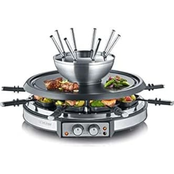 For parties - With 8 pans, scrapers and fondue forks, the SEVERIN Raclette fondue combination is ideal for celebrations or large rounds with family or friends. EASY CLEANING - The non-stick pans can be easily rinsed under running water, the stainless steel fondue pot is dishwasher safe. Versatile enjoyment - Thanks to separately adjustable heating elements for raclette and fondue function, the device is also ideal for chocolate or cheese fondue. Gentle preparation - On the included grill stone, both fish or vegetables can be gently prepared and food kept warm. Details - SEVERIN raclette grill with 8 raclette pans and scrapers each as well as fondue forks, raclette fondue combination for 8 people, 1900 W power, item no. 2348