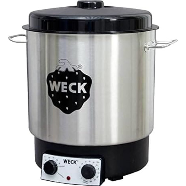 The preserving machine can not only be used to preserve food, but also for juicing fruit. The high-quality stewing pot is made of rust-proof stainless steel and therefore particularly durable. The canning machine has an overheating protection, precision thermostat and juicer circuit. Technical data: lid: plastic, black, diameter: 35 cm, capacity: 30 litres or 14 jars of 1 litre, power supply: 230 V, 1800 W Box contents: 1 x fully preserving machine WAT25; Product description Weck fully automatic preserving machine model WAT 25 - stainless steel. Rustproof 18/10 stainless steel, brushed. Closed pot base. Precision thermostat Overheating protection. Juicer circuit. Indicator light. With clock (synchronous timer). With insert grate. Brushed stainless steel pot 18/10. Stainless steel cold handles. With black plastic lid and base. Technical details: Lid: plastic, black. Diameter: 35 cm. Contents: 30 litres or 14 glasses of 1 litre each. Power supply: 230 V, 1800 W. Box contents: 1 x fully preserving machine WAT25.; Product description Weck fully automatic preserving machine model WAT 25 - stainless steel. Rustproof 18/10 stainless steel, brushed. Closed pot base. Precision thermostat Overheating protection. Juicer circuit. Indicator light. With clock (synchronous timer). With insert grate. Brushed stainless steel pot 18/10. Stainless steel cold handles. With black plastic lid and base. Technical details: Lid: plastic, black. Diameter: 35 cm. Contents: 30 litres or 14 glasses of 1 litre each. Power supply: 230 V, 1800 W. Box contents: 1 x fully preserving machine WAT25.; Weck fully automatic preserving machine model WAT 25 - stainless steel. Rustproof 18/10 stainless steel, brushed. Closed pot base. Precision thermostat Overheating protection. Juicer circuit. Indicator light. With clock (synchronous timer). With insert grate. Brushed stainless steel pot 18/10. Stainless steel cold handles. With black plastic lid and base. Technical details: Lid: plastic, black. Diameter: 35 cm. Contents: 30 litres or 14 glasses of 1 litre each. Power supply: 230 V, 1800 W. Box contents: 1 x fully preserving machine WAT25.