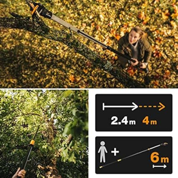 Bypass telescopic loppers for fresh, young shoots, branches and branches up to 3.2 cm in tree tops and dense bushes - without the aid of a ladder - with a maximum total reach including user of 6 m Optimised cutting head for special efficiency and durability, manually rotates 230° and can be fixed in any position for cutting strongly branched branches, clean cuts thanks to non-stick coated top blade and hardened counter blade, orange extension on lower blade for better fixing of the branch Adapts to the cutting height thanks to telescopic handle for reaching the branches at high heights, internal rope system by pulling the end handle for optimal power transmission and effortless cutting during long lasting work, optimised extended handle with non-slip and wear-resistant coating for a secure hold and high durability High durability thanks to hardened steel blade and aluminium handle, can be combined with adapter pruning saw (item number: 1023633) and fruit picker (item no.: 1001562), original spare parts available, Finnish design Box contents: 1 x Fiskars UPX86 telescopic bypass cutting giraffe, length: 2.4 – 4 m, weight: 1.9 kg, material: steel/aluminium, colour: silver/black/orange, 1023624